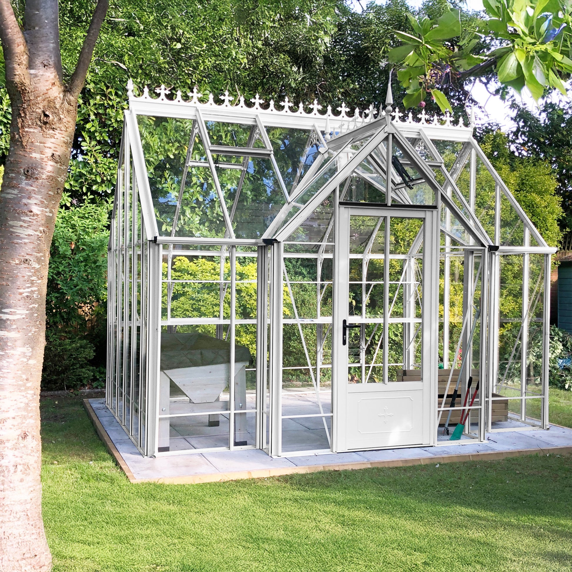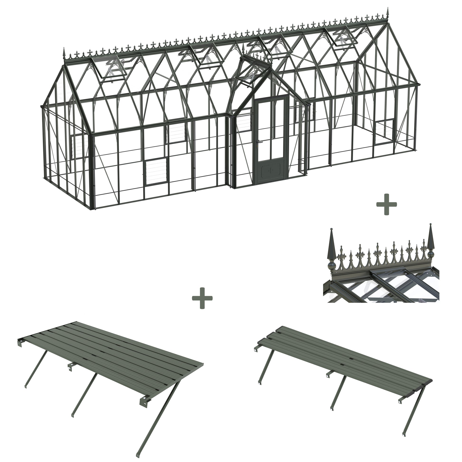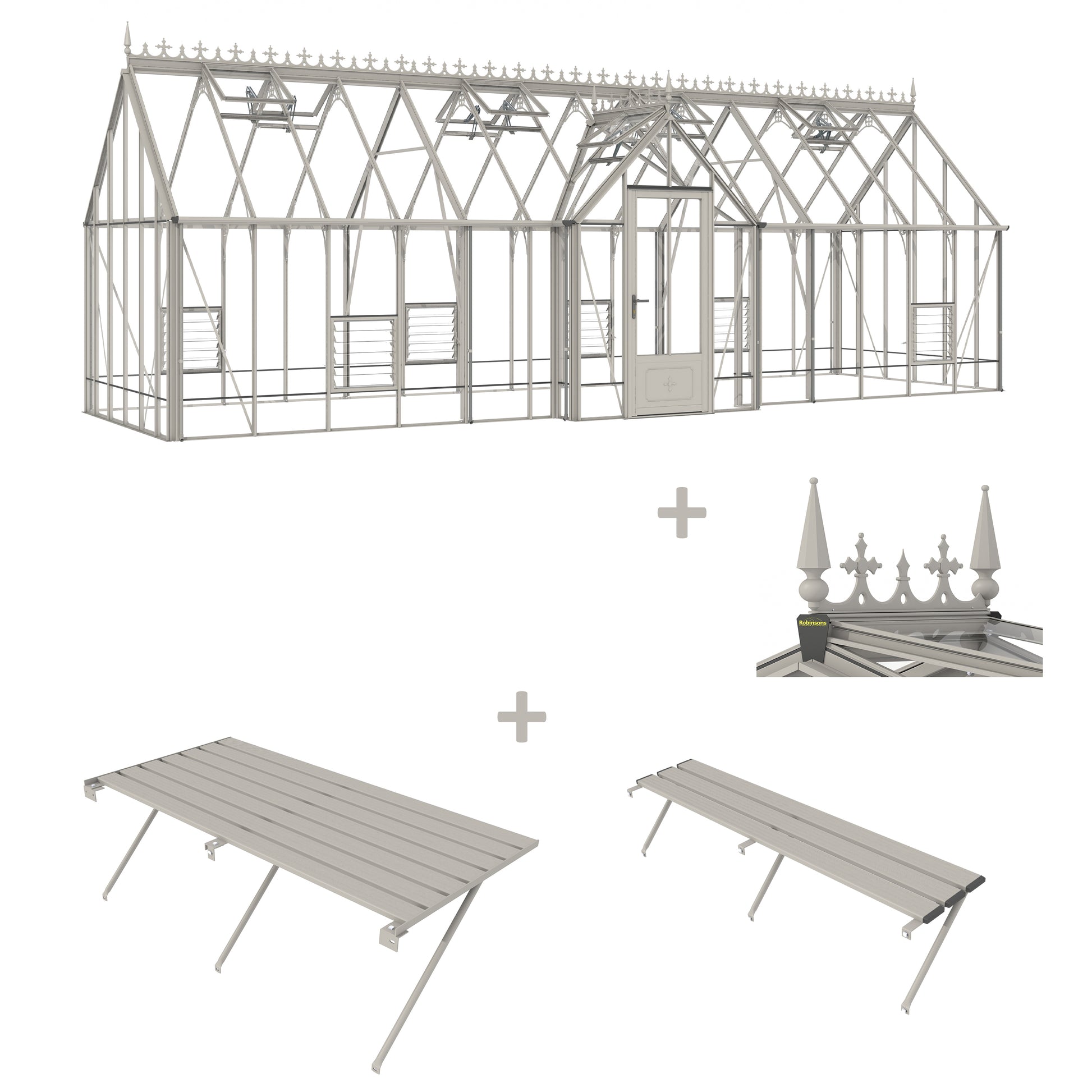 Discover the exquisite Robinsons Radley greenhouse, a glass-to-ground version of the Rushby model that brings Victorian elegance to your garden. With a starting length of 8'8" and the ability to extend using 8'1" modules, it offers versatility to fit your desired dimensions.