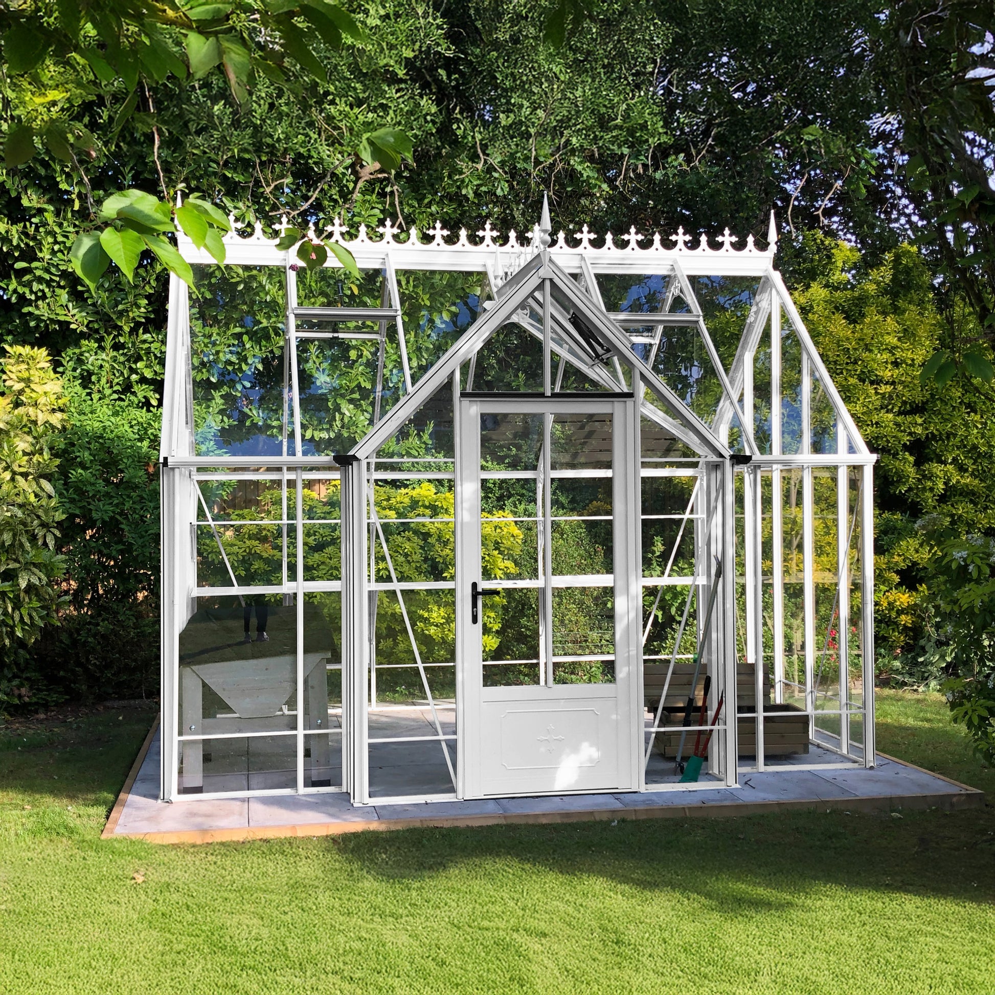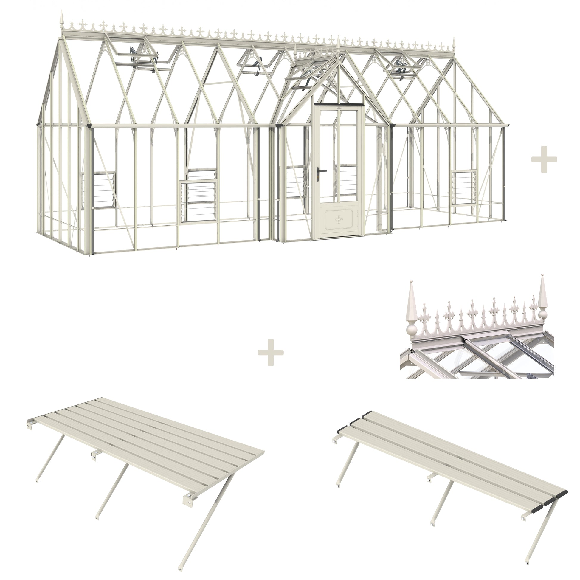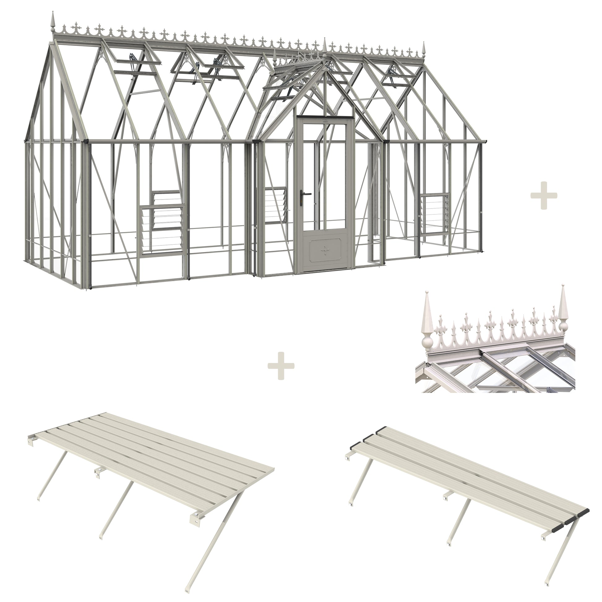 Discover the exquisite Robinsons Radley greenhouse, a glass-to-ground version of the Rushby model that brings Victorian elegance to your garden. With a starting length of 8'8" and the ability to extend using 8'1" modules, it offers versatility to fit your desired dimensions.