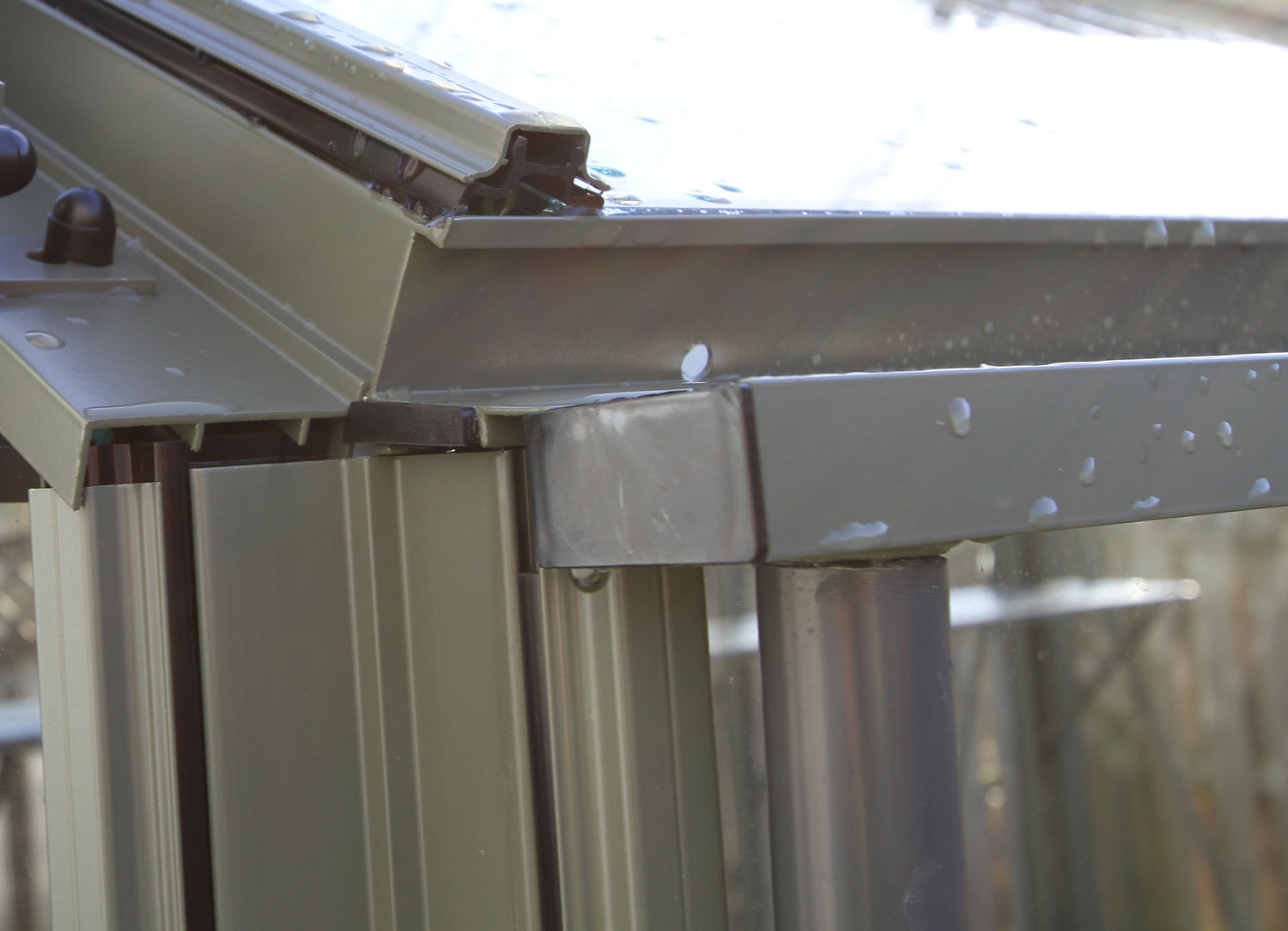 Our integral aluminium guttering is extremely neat and strong being built into the design of the greenhouse at eaves height. Two 25mm PVC downpipes take the rainwater away and we provide a range of optional extra fittings should you wish to collect and use this valuable natural resource.