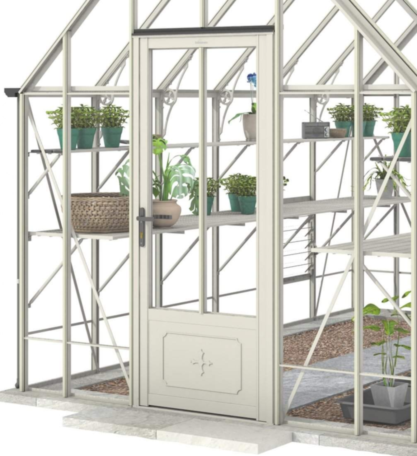 The lockable hinged greenhouse door with deep glazed panes and embossed Victorian styling at the base combines functionality, elegance, and a touch of nostalgia. It not only provides a secure entrance to your greenhouse but also enhances its visual appeal, creating a delightful space to nurture your plants and enjoy the beauty of nature.