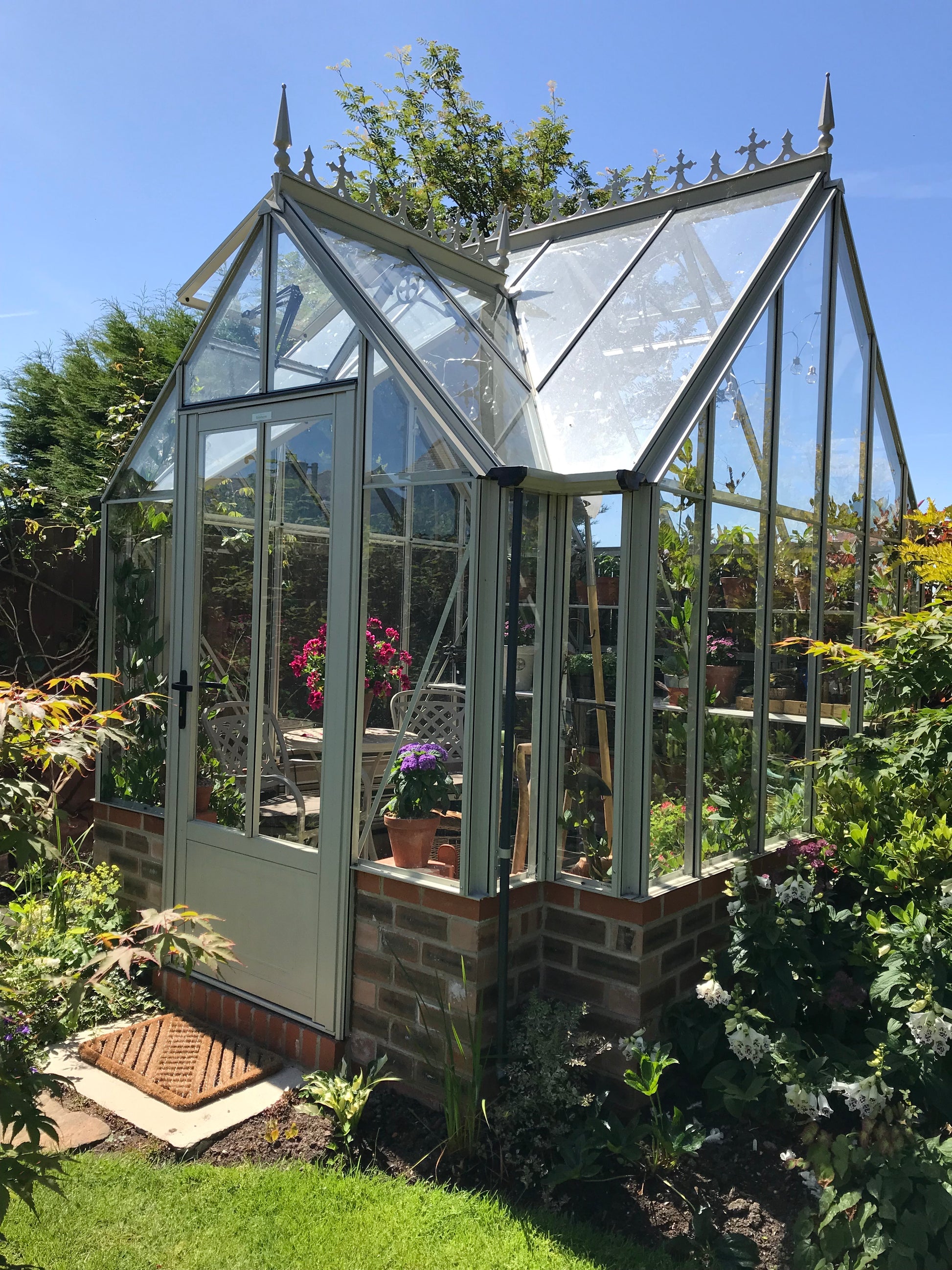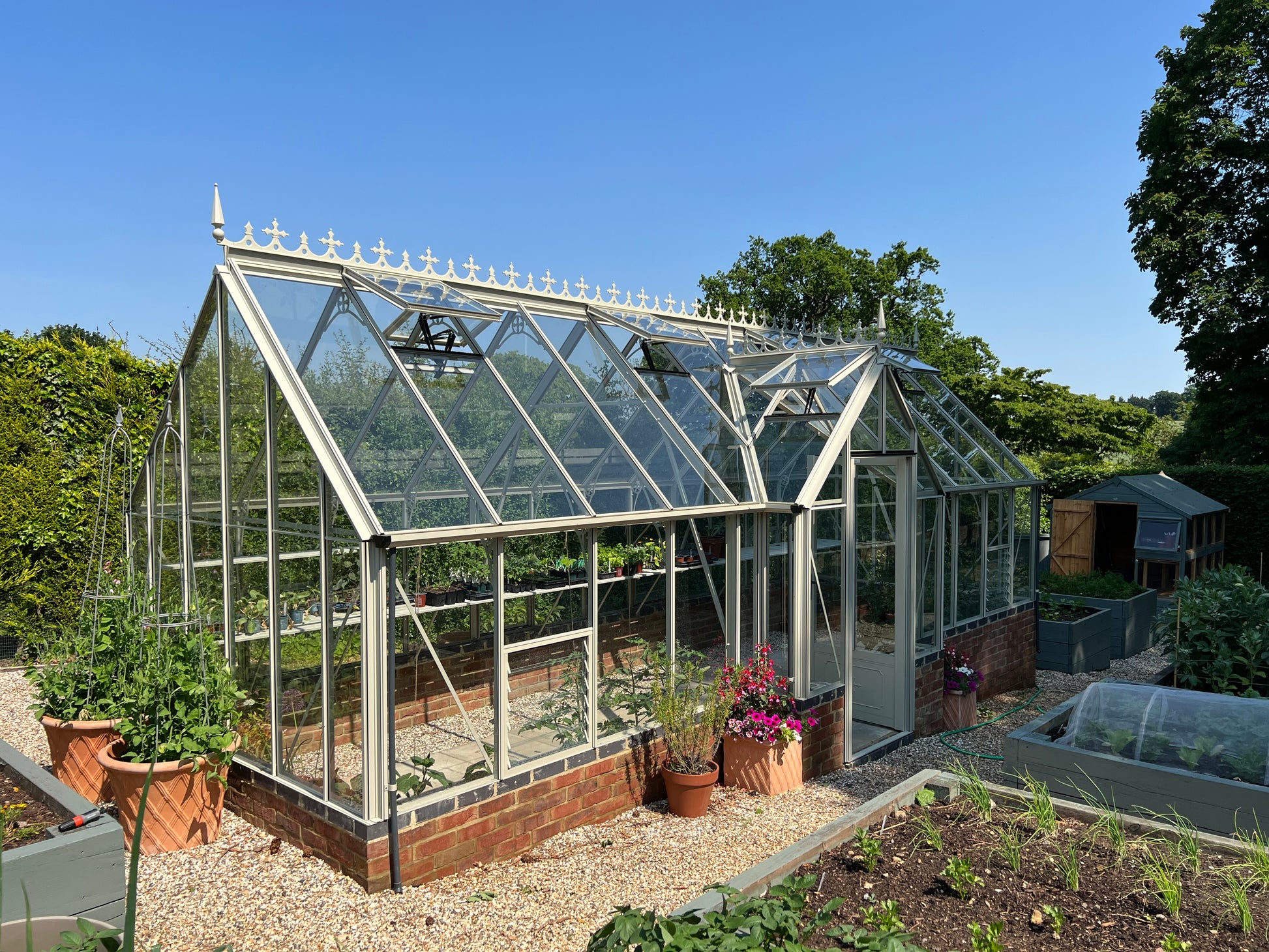 The Rushby greenhouse is thoughtfully appointed with ample ventilation provided by numerous automatic roof vents and an abundant number of louvre vents, varying based on the greenhouse's length. To complete the stylish Victorian look, consider adding the optional colour-coordinated, cast aluminium ridge cresting and finials, turning it into a standout feature in your garden while providing a perfect growing space. Please note that the image shown features an additional hinged door at the gable end, offering even more convenience and versatility.